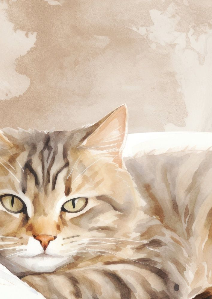 De compositie en de aquarel-achtige stijl geven het werk een serene, warme uitstraling. Het is een ideaal kunstwerk voor liefhebbers van katten en mensen die op zoek zijn naar een rustgevend, sfeervol stuk voor in huis. Het past goed in een modern, Scandinavisch of landelijk interieur.