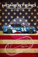 Illustratie van een serie legendarische Nascar circuits en raceauto's.