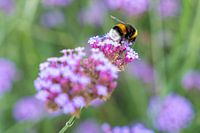 Een hommel voedt zich met de nectar van de lila kleurige bloem "verbena bonariensis"- gefotografeerd tegenover de groene en paarse out-of-focus achtergrond.