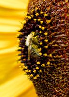Een hommel diep weggedoken in het hart van een zonnebloem, bedekt met stuifmeel. Deze macrofotografie laat de wonderlijke wereld van bestuivers van heel dichtbij zien. De warme gele tinten en het contrasterende donkerbruin maken dit beeld niet alleen een ode aan de natuur, maar ook een kleurrijke eyecatcher voor elk interieur. Perfect voor natuurliefhebbers en iedereen die de schoonheid van details waardeert.