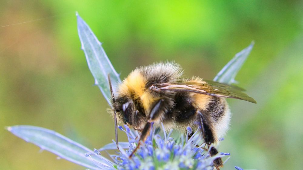Hommel op een bloem die necta verzamelt. Insect uit de natuur aan het eten. Macro-opname van een insect
