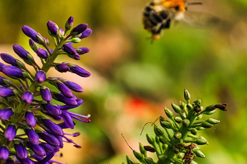 Hommel vliegt op een bloem om nectar te verzamelen. Insect uit de natuur aan het eten. Macro-opname van een insect