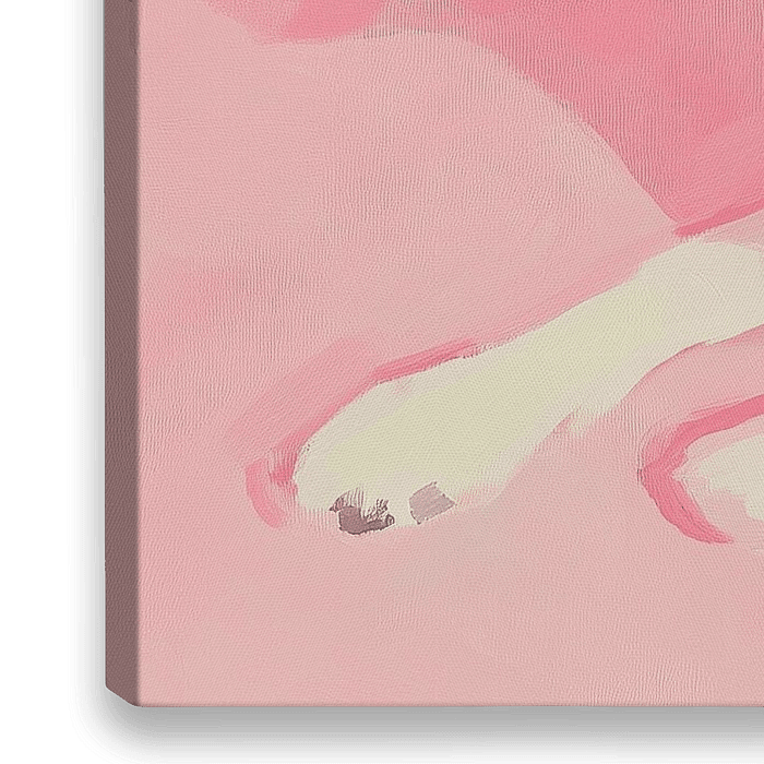 Een witte Labrador ligt op een roze achtergrond, in de stijl van een olieverfschilderij met roze en gele tinten, een minimalistische illustratie met eenvoudige lijnen die doen denken aan kinderillustraties, waardoor een schattig en dromerig tafereel ontstaat.
