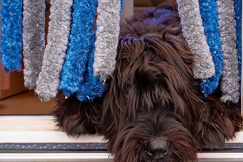 De briard is een zwarte hond. Tijdens de kampeer vakantie ligt de hond in de deuropening tussen het vliegengordijn nieuwsgierig naar buiten te kijken.