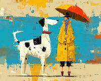 Hond en Regenjas - Dit hondenschilderij illustreert een grote hond naast een persoon in een geel regenjas en een gestippelde paraplu, uitgevoerd met duidelijke blokken en textuurrijke verfstijlen waarbij geel en blauw domineren.