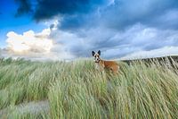 Hond in de vrije natuur op een duin tussen hoog helmgras tegen een hemel met zware bewolking