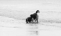 Deze hond trof ik aan op het strand van Zoutelande,Zeeland Nederland.Ik vond het een leuk speels beeld van een hond die enthousiast de zee ging verkennen,opname is gemaakt in het begin van de middag.Het beeld is omgezet naar zwart/wit.