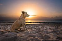 Hond zittend op het strand met zee en zonsondergang op de achtergrond
