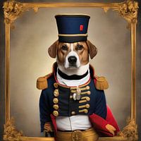 Een leuk beeld van een hond verkleed als Napoleon in leuke kleuren.