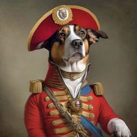 Een leuk beeld van een hond verkleed als Napoleon in leuke kleuren.