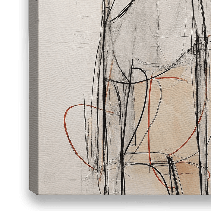 Hond - Het kunstwerk toont een gestileerde hondenvorm met uitgesproken zwarte oren en ogen, waarbij de lijnen speels maar doordacht over het doek lijken te dansen. Beperkt kleurgebruik van voornamelijk zwart, wit en bruine tinten met enkele opvallende oranje accenten zorgt voor een moderne en toch warme uitstraling. De schetsmatige…