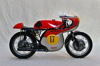 Rood, klein, snel en mooi Deze Japanse racemachine baarde opzien tijdens de Tourist Trophy op het eiland Man. Tal van wereldberoemde racers zagen de geblokte vlag op de eerste rij met deze machine.
