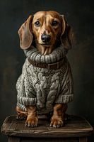 Prachtig portret van een kortharige teckel. De hond heeft een warme wintertrui aan. Het geheel is in prachtige groen, bruin, grijstinten.