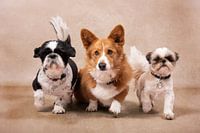 Een vintage achtergrond en alle drie de honden komen tegelijk in beweging.