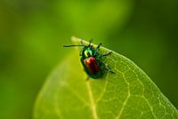 Hondsgifkever op bladpunt - De Latijnse naam van de hondsgifkever is Chrysochus auratus. De kever komt oorspronkelijk uit Noord-Amerika. Hij heeft een mooie metallic groenrode kleur.