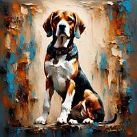 Een driekleurige Beagle met een bedachtzame uitdrukking zit prominent tegen een getextureerde achtergrond die warme en koele tinten mengt. Gedurfde penseelstreken en een rijk kleurenpalet geven het werkstuk een dynamische en bijna driedimensionale uitstraling.