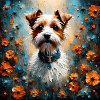 Een kleine terriër met heldere, oplettende ogen staat in het midden van de afbeelding, omringd door een wirwar van oranje bloemen op een koele achtergrond. De hond draagt een blauwe kraag die een contrasterende kleur toevoegt aan zijn warme bruine en witte vacht.
