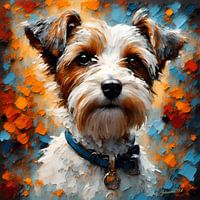 Een close-up portret van een witte en bruine hond met een expressief gezicht en aandachtige blik, voorzien van een blauwe halsband met een metalen ring. De achtergrond bestaat uit levendige, abstracte vormen in oranje, blauwe en witte tinten die een rijke textuur toevoegen aan de algehele scène.