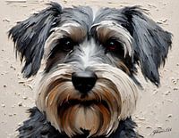 Een digitale close-up van een hond met opvallende, expressieve ogen en een ruige grijsbruine vacht domineert het frame. De vachttextuur en kleurvariaties van de hond worden weergegeven met gedetailleerde penseelstreekeffecten die een levensechte uitstraling creëren.