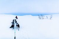 Een husky hondenteam van zeven huskies trekt een slee voort over een bergpas. Foto is genomen tijdens een husky trektocht in het Dividal National Park.