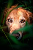 De ogen van een stralende goudkleurige hond fonkelen uit het dichte groen, alsof ze de geheimen van de natuur bewaken. De levendige ogen stralen warmte en onschuld uit. Ideaal voor in de woonkamer om een uitnodigende en liefdevolle sfeer te creëren die een glimlach op het gezicht van elke bezoeker tovert.