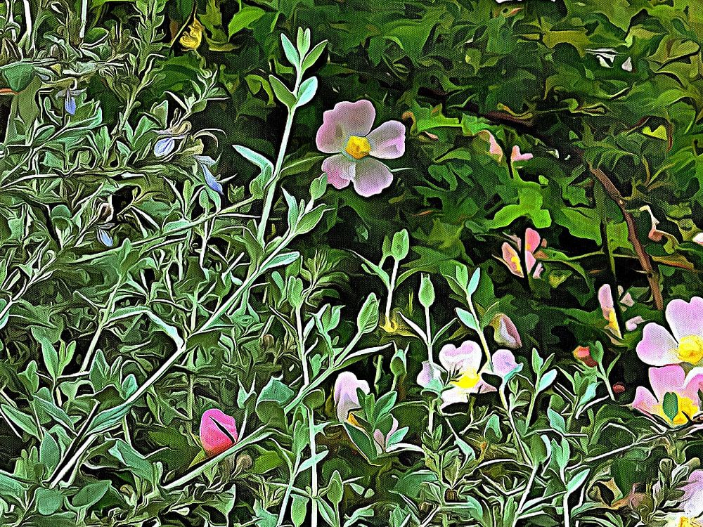 Ik vind het prachtig hoe deze zachtroze hondsroos, rosa canina, is opgegroeid in de teucriumhaag die ernaast groeit. De hondsroos is een klimplant met gehaakte stekels die werken als grijphaken. Daardoor kan hij tegen of door andere planten heen groeien, zoals hier. In dit geval vullen de twee planten elkaar prachtig aan! De bloemen van de hondsroos met hun zoete geur trekken bestuivers aan, net als de sterk geurende blauwe bloemen van de teucrium. De teucrium bloeit een paar maanden eerder dan de hondsroos, die naar mijn gevoel profiteert van het vroege werk van de andere plant. Ik denk dat het een evenwicht is tussen de twee, zoals ik heb geprobeerd weer te geven in deze foto.