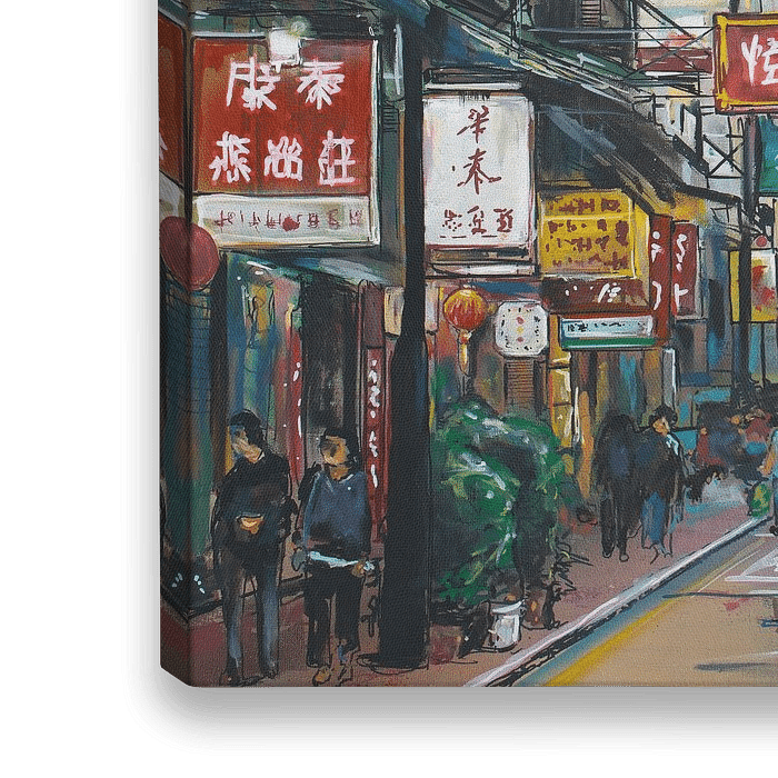 Dit prachtige schilderij van Hong Kong toont zijn kleurrijke en drukke straten waar auto's en voetgangers doorheen razen. De 'jungle' van borden en advertenties, met hun Chinese karakters, creëren een levendige, chaotische sfeer - de hartslag van de stad die nooit slaapt.