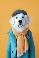 Met een charmant vleugje elegantie presenteert de Hongaarse Kuvasz zich in een stijlvolle jas en modieuze pet. Zijn pluizige, witte vacht straalt zachtheid uit, terwijl de gele sjaal hem een speels tintje geeft. De oplettende ogen stralen intelligentie en loyaliteit uit - een werkelijk betoverend gezicht dat harten verovert.