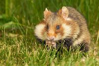 Europese hamster in de vrije natuur. Deze hamster komt kijken of de kust veilig is om zijn hol te verlaten. Ze eten graag bloemen en besjes.