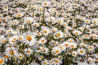 Honingbij bezoekt bloeiende margrieten. De foto is aan het einde van het voorjaar gemaakt bij een Nederlandse kwekerij op het voormalige eiland Tholen, provincie Zeeland.