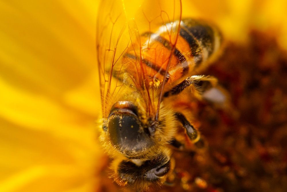 Honingbij in zonnebloem II - De zon liet de zonnebloem en de bij gloeien. Het lichaamshaar van de honingbij is verlicht op de macrofoto. Ze geniet gretig van het stuifmeel en de nectar van de zonnebloem. Deze macrofoto van de honingbij toont het zijprofiel van de honingbij.