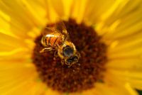 Honingbij in zonnebloem - Honingbij in zonnebloem - De zon liet de zonnebloem en de bij gloeien. Het lichaamshaar van de honingbij is verlicht op de macrofoto. Ze geniet gretig van het stuifmeel en de nectar van de zonnebloem.