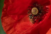Een kleine honingbij zoekt stuifmeel op een klaproosbloem. De achtergrond is rood. De stamper is duidelijk zichtbaar. Het is zomer in Beieren.