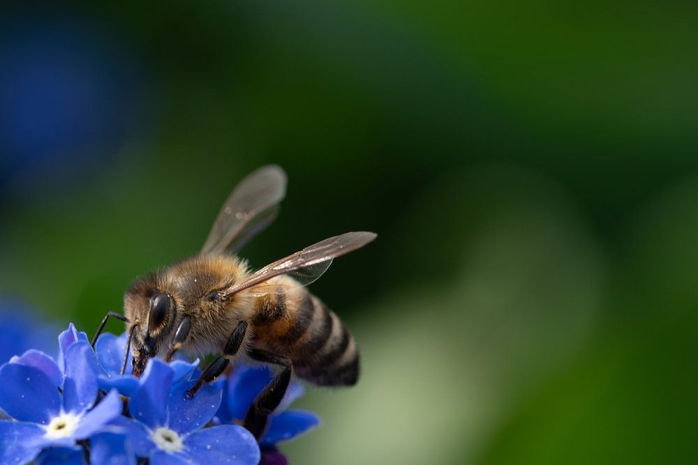 Een kleine honingbij zoekt naar stuifmeel op de blauwe bloemen van het vergeet-mij-nietje. De achtergrond is groen