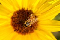 Honingbij op zonnebloem 0704-5 - Juni en juli zijn de maanden waarin de voorjaarsbloemen zijn uitgebloeid en de zomerbloemen nog niet zijn begonnen te bloeien. Zonnebloemen, bruine weegbree en aardperen staan in bloei en de honingbijen genieten ervan.