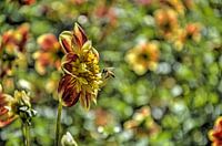 Een bij nadert een dahlia op zoek naar honing. Op de achtergrond een kleurig bokeh.
