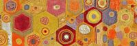 Op het doek ontvouwt zich een rijk tapijt van zeshoekige motieven in tinten honinggeel, warm oranje en robijnrood. Elke vorm is opgebouwd uit duizenden subtiele stipjes die samen een mozaïekachtig reliëf vormen, met hier en daar zachte perzikkleurige accenten en verweerde lila schakeringen.