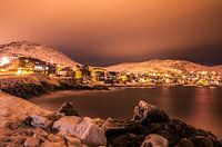 Honningsvag in Noorwegen. Het meest noordelijke puntje bij de Noordkaap, Finnmark. Dit is de skyline van de stad in de poolnacht. Een landschap in de winter met sneeuw en ijs.