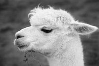 Zwart-wit foto van de kop van een alpaca met een grasspriet in zijn bek