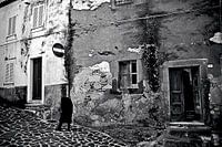 Een hoogbejaarde oude vrouw loopt langzaam door de steeg van een klein Sardijns bergdorpje. Door haar zwaar gebogen loophouding lijkt ze hoofdloos. De vervallen huismuren en oude kasseien geven het tafereel een sombere en armoedige sfeer. De abstractie van de kleurwaarden in klassiek zwart-wit creëert een tijdloos, mysterieus,…
