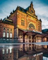Het Hoofdstation Groningen na zonsondergang tijdens het blauwe uur. In de voorgrond is het mooie gebouw in speigelbeeld te zien in een plas van smeltwater.