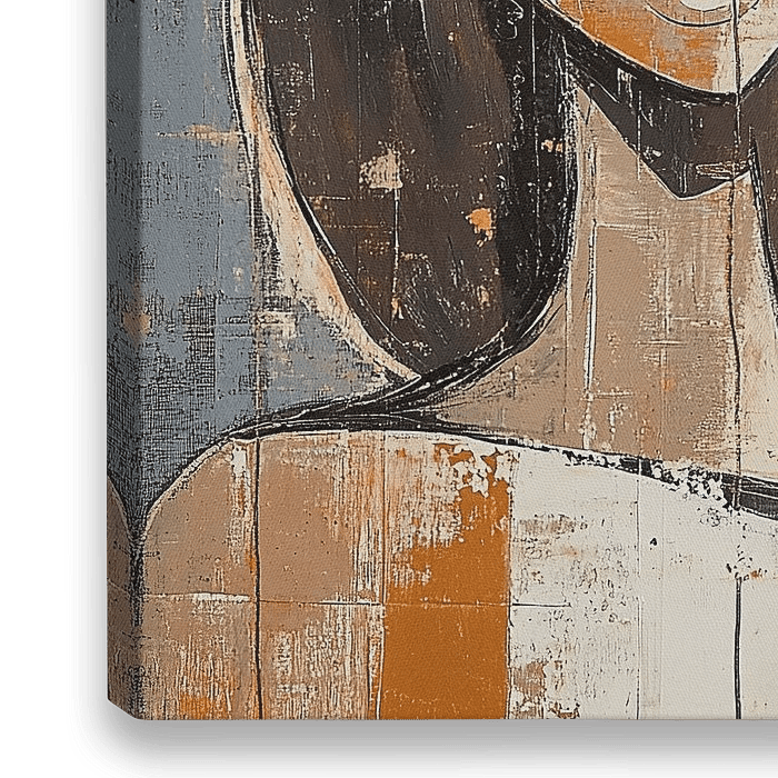 Hoofdtelefoon - Dit vrouwen schilderij toont een jonge vrouw met gesloten ogen en grote witte hoofdtelefoon, uitgebeeld in een gestileerde, moderne vorm met een achtergrond die de ruwe, industrieel-geïnspireerde texturen van versleten blauw en oranje benadrukt, wat een gevoel van rust en isolatie uitstraalt.