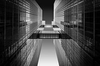 Een omhoogkijker naar de hoge moderne architectuur gebouwen van een bedrijf in Munchen.