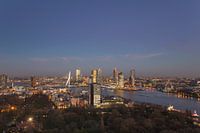 Zoals foto 'nacht in Rotterdam' is ook deze foto vanaf de Euromast te Rotterdam (Zuid-Holland, Nederland) genomen. Deze foto laat een ander stadsdeel zien. Onder andere de Erasmusbrug en de Willemsbrug zijn te zien. Door de vallende nacht krijgt de foto een fijne sfeer. De vele lampen geven het geheel een sprookjesachtige uitstraling. Rivier de maas ligt er vredig bij.