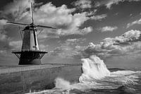 Een krachtig zwart-wit beeld van de iconische Oranjemolen in Vlissingen, vastgelegd tijdens een stormachtige dag gecombineerd met hoog water. De golven beuken tegen de muur, terwijl de molen fier overeind blijft in het woeste weer. Boven het tafereel ontvouwt zich een dramatische wolkenlucht, die het contrast tussen natuurgeweld en menselijke bouwkunst versterkt.