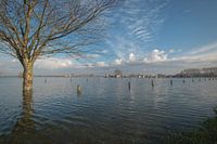 De uiterwaarden zijn door regen en smeltwater uit de Alpen volgelopen. Bomen en struiken staan onder water. De vizierschuiven van stuw- en sluizencomplexen staan omhoog in verband met het hoge water.