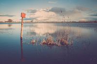 Rijzend hoogwater in de uiterwaarden van rivier de IJssel nabij Zalk met uitzicht op Zwolle. Holland op zijn mooist met prachtige Nederlandse wolkenlucht die reflecteert in de waterspiegel.