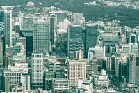 Hoogbouw en skyline van Seoul in Zuid Korea gezien vanop een bergtop in de stad. Met voornamelijk blauw en groen tinten voor een cinematische sfeer.
