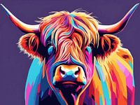 Een Highland koe in pop-art stijl barst van de levendige kleuren en gedurfde, grafische lijnen. De opvallende, ruige vacht is herschapen in elektrisch roze en blauw, contrasterend tegen een speelse, psychedelische achtergrond. De koe's expressieve ogen en prominente horens trekken de aandacht en belichamen een grillige fusie van natuur en moderne kunst die zowel levendig als iconisch is.