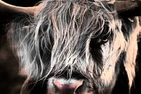 Een rustgevende illustratie van een portret van een hooglandkoe in zwart-wit in gouden licht.